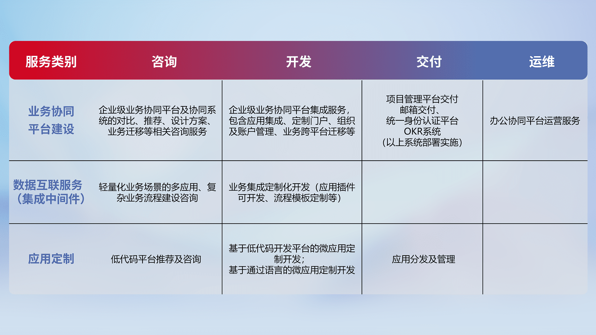 针对钉钉、、、企微、、、、IDaas等平台级产品提供产品的规划、、方案、、、、交付、、、定制化开发等服务,,,,实现如统一协同办公、、、、智能客户服务、、、混合会议管理、、智能数据查询、、、、等业务场景,,,实现数字化转型。。。